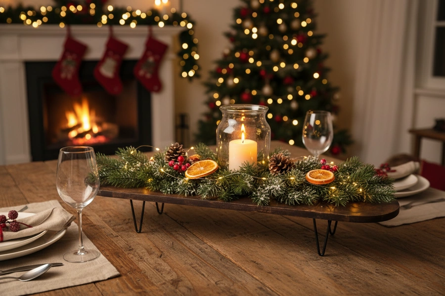 Elegancka podstawka wykonana z drewna w odcieniu ciemnego brązu, osadzona na solidnych metalowych nóżkach. Prosta, a zarazem nowoczesna forma sprawia, że świetnie sprawdzi się jako element dekoracyjny i użytkowy. Idealna do ekspozycji świec, kwiatów, dekoracji świątecznych czy codziennych aranżacji stołu.