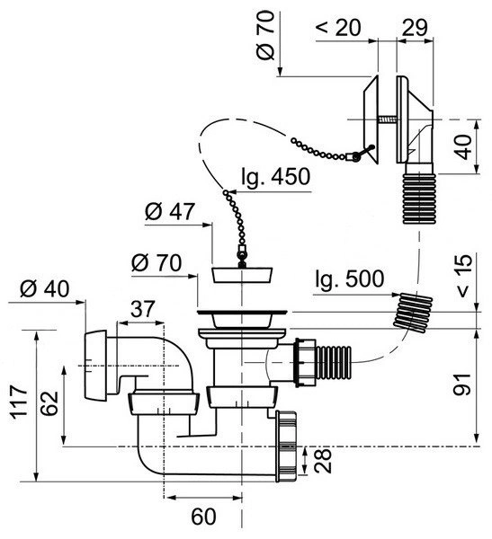 - Syfon wannowy z korkiem z łańcuszkiem i metalowym sitkiem ''STANDARD'' Tycner
