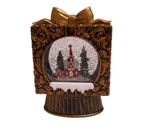 Dekoracyjny lampion w formie eleganckiej kuli umieszczonej z domkiem i choinkami w prezencie, wykończony w odcieniu brązu z patyną. Subtelne światło LED rozświetla wnętrze lampionu, tworząc ciepły i przytulny klimat, idealny na zimowe wieczory. Stanowi efektowną ozdobę stołu, komody, parapetu czy świątecznego stroika. To nie tylko nastrojowe źródło światła, ale także stylowy element dekoracyjny, który pięknie podkreśli magię świąt.