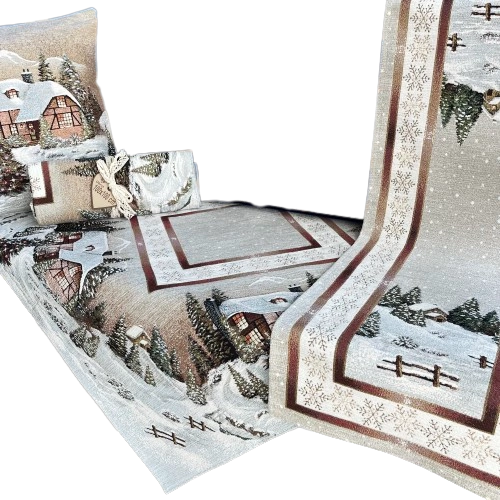 Obrus przygotowany ze świątecznym motywem lasu oraz domku, obszyty złotą nitką. Jest cudowną dekoracją stołu w jadalni, kuchni czy salonie. Tak dobrana kolorystyka doskonale wpisuje się w okres świąt Bożego Narodzenia, stając się dodatkową dekoracją wnętrza.