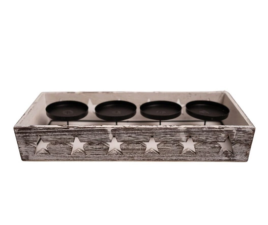 Dekoracyjny świecznik w formie prostokątnej skrzynki w eleganckim szarym kolorze z wyciętymi gwiazdkami, przystosowany na 4 świece. Świetnie sprawdzi się jako centralny element stołu, komody czy parapetu. Minimalistyczny design łączy funkcjonalność z nowoczesnym stylem, wprowadzając do wnętrza przytulny i nastrojowy klimat.