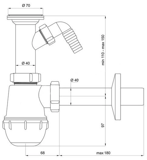 - Syfon zlewozmywakowy butelkowy pojedynczy z metalowym sitkiem fi 70mm z wyjściem do pralki/zmywarki