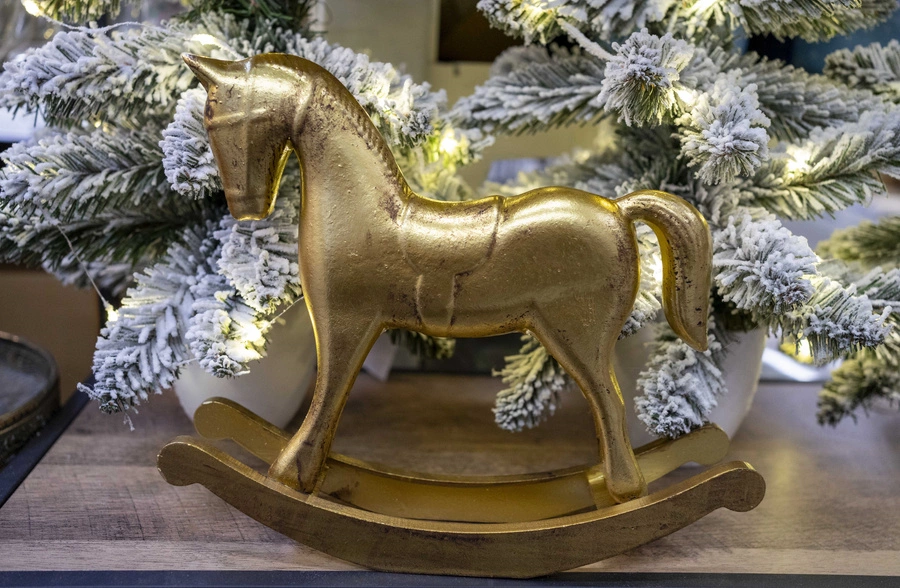 Złoty koń na biegunach o wymiarach 26x23 cm to dekoracja, która natychmiast przyciąga wzrok i wprowadza przytulny, świąteczny klimat do każdego wnętrza. Jego elegancka, połyskująca powierzchnia pięknie odbija światło, tworząc niepowtarzalną atmosferę pełną ciepła i radości. Ten ponadczasowy motyw nawiązuje do beztroskich chwil dzieciństwa i magii Bożego Narodzenia, czyniąc go idealnym wyborem zarówno do tradycyjnych, jak i nowoczesnych aranżacji. Złoty konik na biegunach to subtelny akcent, który doda klasy i stylu każdemu pomieszczeniu.
