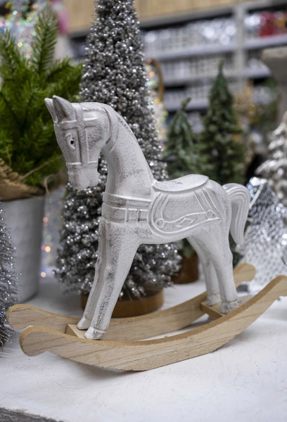 Koń na biegunach biały przycierany na drewnianych płozach to niezwykła ozdoba, która przenosi w świat dziecięcych wspomnień i świątecznych opowieści. Jego subtelnie postarzana, biała powierzchnia pięknie kontrastuje z naturalnym wykończeniem płóz, tworząc dekorację pełną nostalgii i domowego ciepła. Ten klasyczny motyw, inspirowany tradycyjnymi ozdobami bożonarodzeniowymi, wprowadza do wnętrza wyjątkowy klimat i zaprasza do wspólnego przeżywania rodzinnych chwil. Idealnie odnajdzie się zarówno w nowoczesnych, jak i rustykalnych aranżacjach, stając się niepowtarzalnym akcentem Twojego domu.
