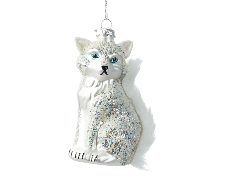 Urocza bombka szklana w kształcie białego lisa pokrytego subtelnym brokatem. Idealna do zawieszenia na choince, do stroików lub dekoracji świątecznych aranżacji. Delikatny, zimowy motyw wprowadza do wnętrza lekkość i bajkowy, świąteczny klimat, a brokat pięknie odbija światło lampek.