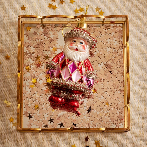 Urocza bombka szklana w kształcie Mikołaja w odcieniach czerwieni i fioletu. Idealna do zawieszenia na choince lub wykorzystania w świątecznych dekoracjach stołu i stroikach. Starannie wykonana, z detalami podkreślającymi charakter postaci, dodaje wnętrzu radosnego i kolorowego, świątecznego klimatu.