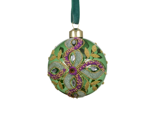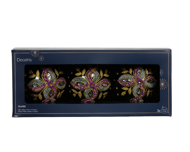 - Bombka szklana 3sztuki 8cm zielona, złoty kwiat fiolet koraliki transparentna