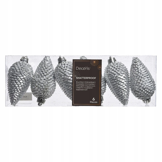 Urocze bombki w postaci srebrnej szyszki, oprószonej brokatem. To dekoracja, która wypełnia czarem całe wnętrze domu, dbając o klimat i nastrój. Idealnie komponują się z okresem zimy i świąt Bożego Narodzenia. Opakowanie zawiera 6 sztuk.
