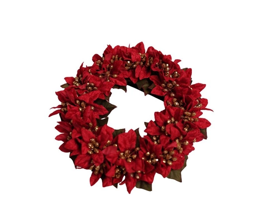 Elegancki stroik bożonarodzeniowy o średnicy 16 cm, ozdobiony czerwonymi gwiazdami betlejemskimi i drobnymi akcentami złotego ryżyku. Idealny do umieszczenia świeczki, pięknie prezentuje się na świątecznym stole, komodzie czy parapecie. Wprowadza ciepły, klasyczny klimat Świąt i stanowi gustowną dekorację wnętrza.