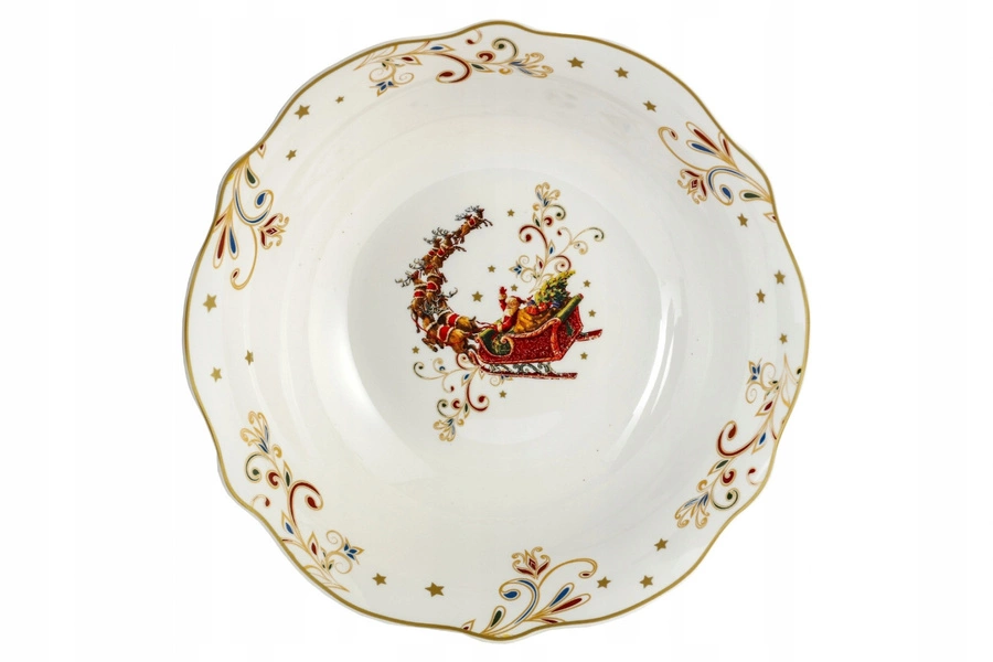Elegancka ceramiczna miska/półmisek ozdobiona świątecznym motywem Mikołaja w saniach oraz wykończona złotymi rantami. Idealna do podawania owoców, słodyczy czy drobnych przekąsek. Sprawdzi się zarówno na wigilijnym stole, jak i jako dekoracyjny akcent w świątecznym wnętrzu.