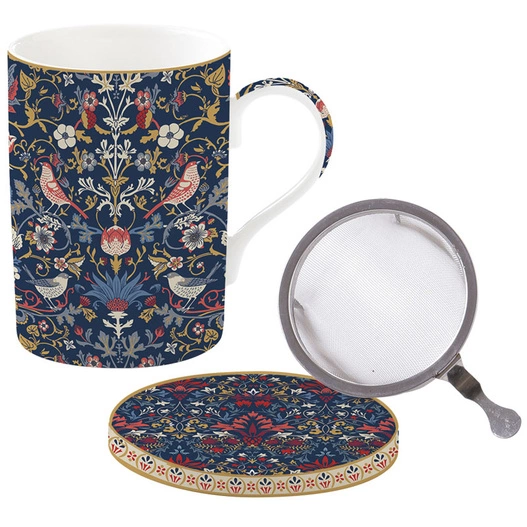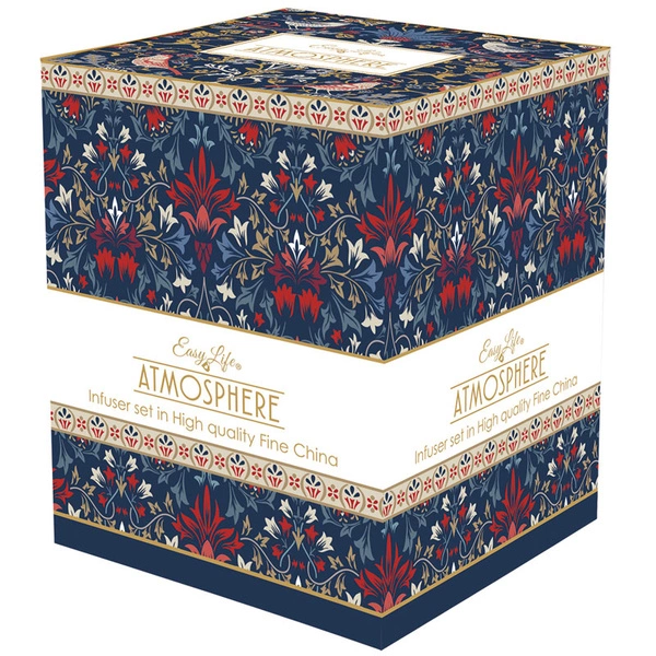 Praktyczny kubek z zaparzaczem i pokrywką o pojemności 350 ml. Wykonany z porcelany w eleganckim granatowym kolorze, ozdobiony motywem czerwonych ptaszków. Dzięki zaparzaczowi idealnie nadaje się do parzenia herbaty liściastej, a pokrywka pozwala dłużej utrzymać ciepło napoju. Doskonały wybór do codziennego użytku lub na prezent.