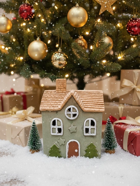 Urokliwy domek ceramiczny LED w zielonym kolorze, z brązowym dachem i drzwiami oraz dekoracyjnymi choinkami. Dzięki oświetleniu LED pięknie rozświetla wnętrze, tworząc ciepły i świąteczny nastrój. Idealny do ustawienia na komodzie, parapecie, stole czy w witrynie. Wysokość 29 cm sprawia, że jest widocznym i efektownym elementem aranżacji bożonarodzeniowych.