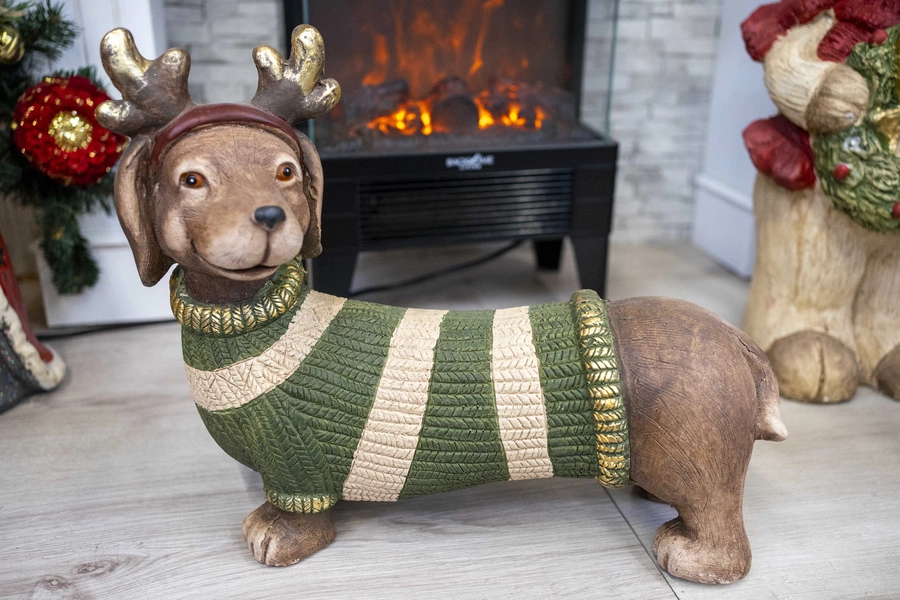 Jamnik ceramiczny brązowy, zielony sweterek, złote rogi 34 x 40cm