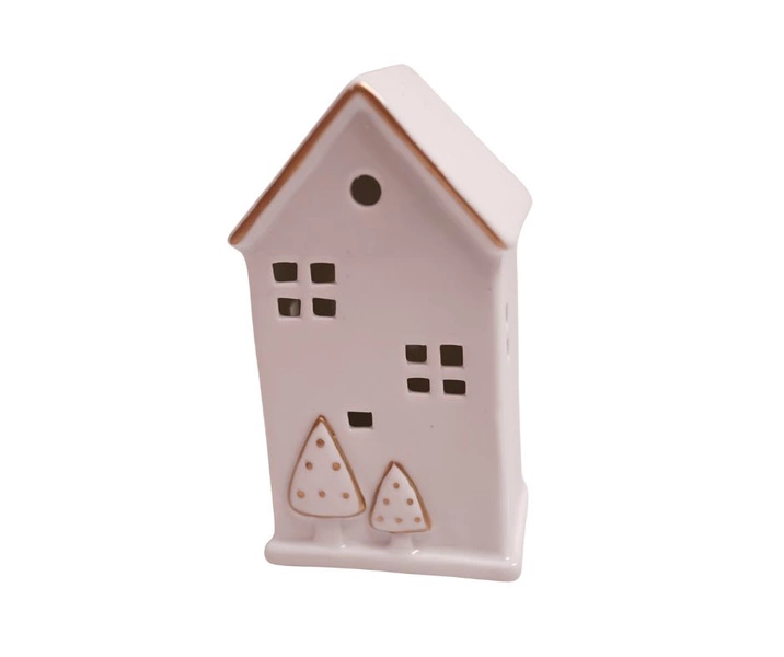 Domek LED biały ceramiczny ze złotymi choinkami 17 cm