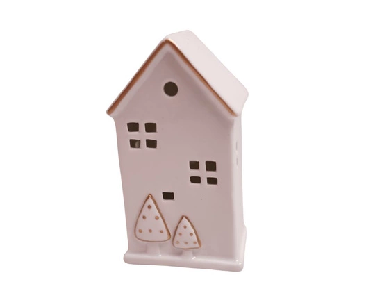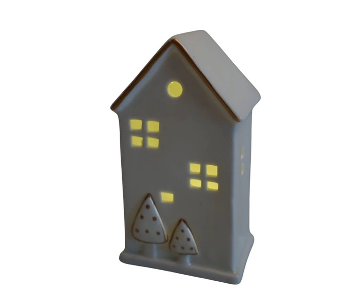 Uroczy domek LED w białym kolorze z motywem złotych choinek to elegancka i nastrojowa dekoracja świąteczna. Po włączeniu rozświetla się subtelnym światłem, tworząc przytulny klimat. Doskonały do ustawienia na półce, komodzie, parapecie lub w stroiku. Świetnie komponuje się z innymi dekoracjami bożonarodzeniowymi, wprowadzając magię Świąt do wnętrza.