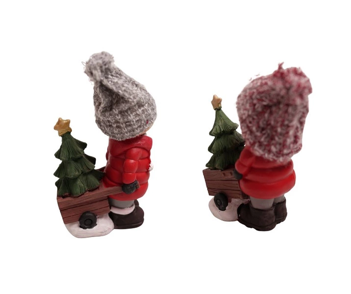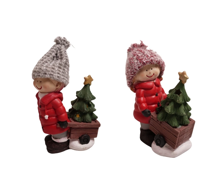 Dziecko ceramiczne ON/ONA w czerwonej kurtce z choinką w taczce 17 cm