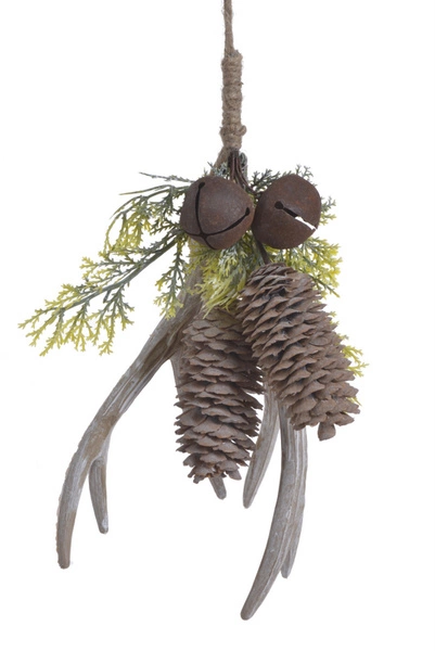 - Stroik o długości 33 cm, wykonany z naturalnych szyszek, gałązek i dekoracyjnych rogów