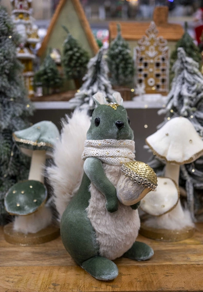 Wiewiórka aksamit miętowa ze złotym żołędziem to dekoracja, która pięknie uzupełni świąteczne aranżacje – na komodzie, pod choinką lub w oknie. Sprawdzi się także jako całoroczny akcent w salonie, sypialni czy pokoju dziecka, wprowadzając radosny, przytulny klimat podczas rodzinnych spotkań i codziennych chwil relaksu. To także wyjątkowy pomysł na prezent, który zachwyci każdego miłośnika oryginalnych ozdób.