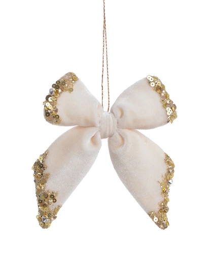 Zawieszka Kokarda aksamit kremowa, złote ranty 11cm to prawdziwa ozdoba, która zachwyca swoją delikatnością i ponadczasowym stylem. Miękki, aksamitny materiał w kremowym odcieniu otula wnętrze ciepłem, a subtelne złote ranty dodają jej elegancji i wyjątkowego uroku. Ta dekoracja sprawdzi się doskonale w świątecznych aranżacjach, ale także przez cały rok – wszędzie tam, gdzie chcesz stworzyć atmosferę pełną harmonii, magii i estetyki. Idealna jako ozdoba choinki, prezentu lub element świątecznego stołu, wprowadzi do Twojego domu nutę wyrafinowanego piękna.