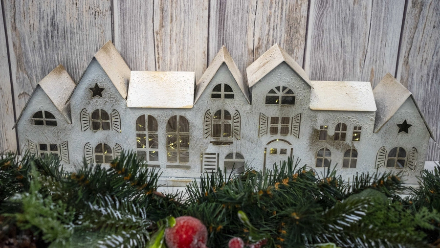 Metalowy świecznik siedem białych domków z szarymi dachami
