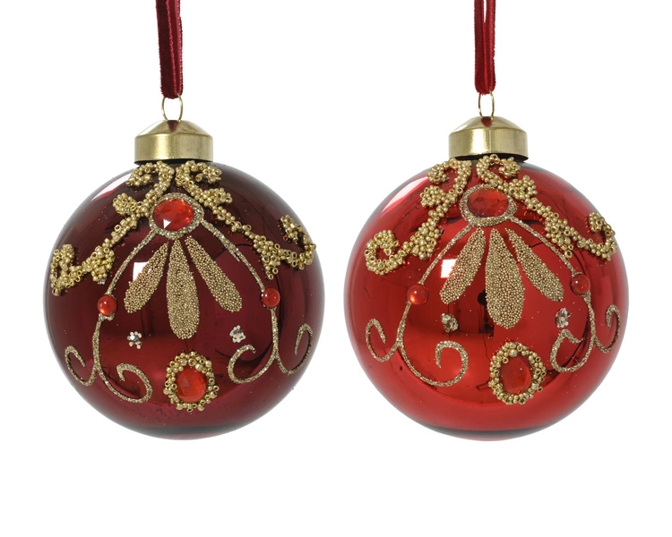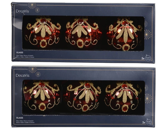 - Bombki szklane czerwone ze złotym brokatem 8 cm – komplet 3 sztuki, 2 wzory