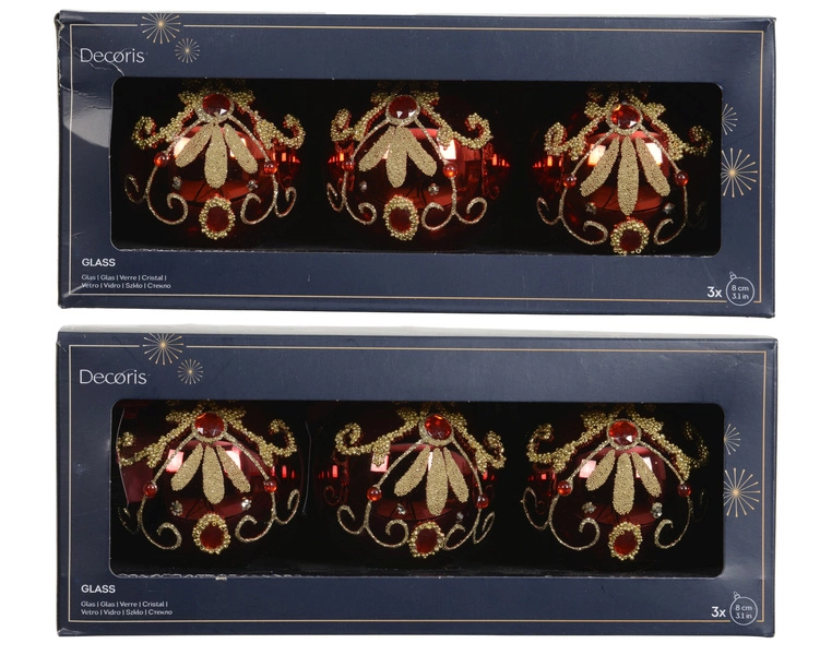 Bombki szklane czerwone ze złotym brokatem 8 cm – komplet 3 sztuki, 2 wzory