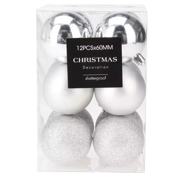 - Bombki srebrne połysk, mat, brokat 6cm 12sztuk