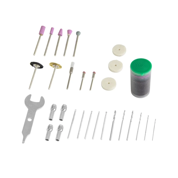 - Kompletacja – mini‑szlifierka, klucz płaski, frezy diamentowe 2,3 mm 5 sztuk, wiertła 6 sztuk, kamienie szlifierskie 5 sztuk, szczotki druciane 2 sztuki, trzpienie 2,3 mm 3 sztuki, filce polerskie 3 sztuki, krążki ścierne 18 sztuk
