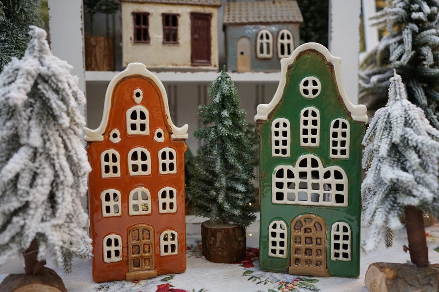 Domek Holenderski T‑light kamienica pomarańczowa, szary dach, brązowe drzwi 2 piętra to urokliwy świecznik inspirowany wąskimi kamieniczkami z nabrzeży kanałów. Pomarańczowa fasada pięknie kontrastuje z szarym dachem, a brązowe drzwi dodają całości ciepła. Po zapaleniu podgrzewacza delikatne światło rozlewa się po „okienkach”, tworząc przytulny klimat w salonie, sypialni czy na świątecznym stole. To dekoracja, która wprowadza nastrój od jesiennych wieczorów po zimowe święta, a jednocześnie świetnie sprawdzi się na co dzień.