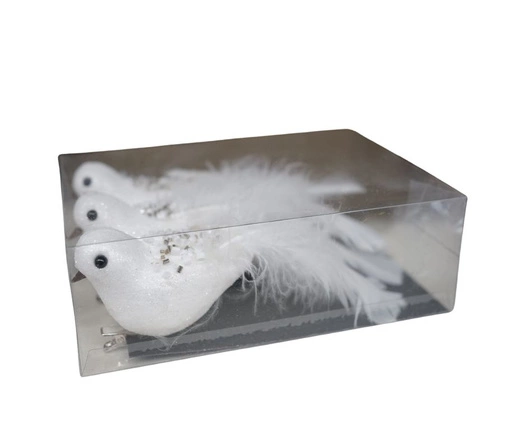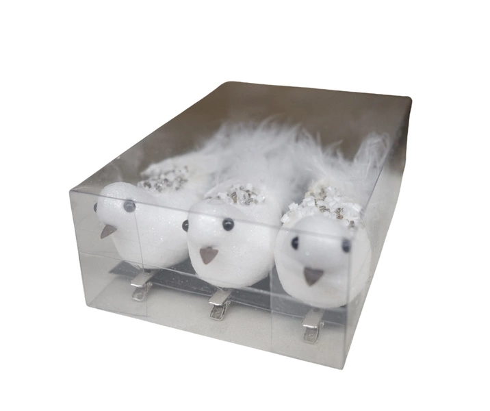 Delikatne, śnieżnobiałe ptaszki na klipsie z migotliwymi koralikami i długim, miękkim ogonem wniosą do przestrzeni subtelny połysk i odrobinę bajkowego nastroju. Ich lekka forma pięknie komponuje się z naturalnymi gałązkami, białymi światełkami i szklaną zastawą. To urokliwa dekoracja, która sprawdzi się zarówno w aranżacjach świątecznych, jak i całorocznych – od romantycznej sypialni po przytulny salon. Zestaw trzech sztuk w pudełku to także gotowy, elegancki pomysł na prezent.
