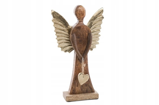 Anioł drewniany brązowy płaski złote metalowe skrzydła 32cm