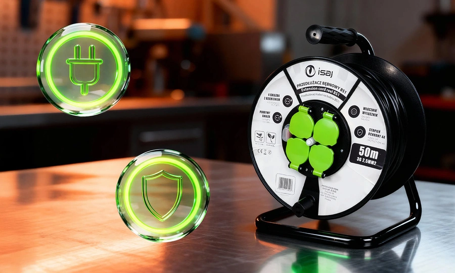 Przedłużacz bębnowy ISAJ BS1 to niezawodne źródło zasilania o długości 50 m z przewodem 3x2,5 mm² i stopniu ochrony IP44. Cztery gniazda z klapkami oraz uziemieniem zapewniają bezpieczną pracę w warunkach domowych, ogrodowych i na budowie. Maksymalna moc 3500 W przy rozwiniętym przewodzie pozwala zasilać wymagające elektronarzędzia, a wbudowane zabezpieczenie termiczne dba o komfort i bezpieczeństwo użytkownika. Produkt identyfikowany jest kodem EAN 5901042113152.