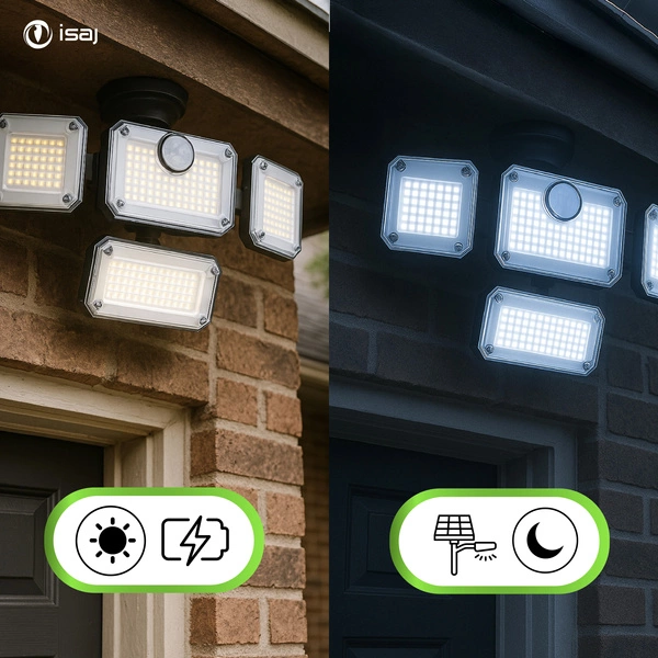 Lampa uliczna ISAJ 300 W 2500 lm zasilanie solarne to kompletne rozwiązanie do oświetlenia ogrodu, podjazdu, ścieżek i elewacji bez prowadzenia okablowania. Trzy ruchome panele LED pozwalają kierować światło dokładnie tam, gdzie jest potrzebne, a osobny panel solarny z przewodem 4,8 m można umieścić w miejscu najlepszego nasłonecznienia. Wbudowany czujnik zmierzchu i czujnik ruchu PIR oraz pilot IR dają wygodę obsługi i wybór trybów świecenia. Obudowa z wytrzymałego ABS oraz stopień ochrony IP65 gwarantują bezproblemową, całoroczną pracę w deszczu, śniegu i kurzu.
