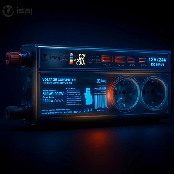 Przetwornica Isaj RN1 zamienia napięcie z akumulatora 12V lub 24V na stabilne 230V AC, dzięki czemu zasilisz sprzęt tak wygodnie jak z domowego gniazdka. To niezależne źródło energii do auta, kampera, ciężarówki, łodzi i zestawów off‑grid. Autorska logika PowerCore Logic zapewnia stabilność pracy, a rozbudowane zabezpieczenia chronią zarówno urządzenia, jak i akumulator. Dwa gniazda 230V, cztery porty USB oraz czytelny wyświetlacz LCD dają pełną kontrolę i wygodę w trasie, na biwaku i w pracy mobilnej.