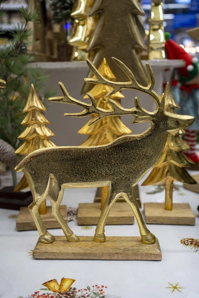 - Renifer metalowy złoty, płaski, na drewnianej podstawce 31×25 cm
