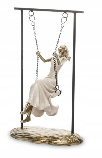 Figurka Kobieta w białej sukience na huśtawce 25,5x15cm to dekoracja, która od razu przyciąga wzrok swoją lekkością i kobiecym urokiem. Smukła sylwetka w prostej, białej sukience delikatnie kołysze się na metalowej huśtawce, tworząc wrażenie zatrzymanego w kadrze, spokojnego popołudnia.