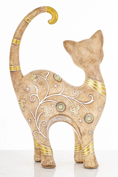 Ta elegancka figurka kota brązowo-złotego będzie pięknie prezentować się na komodzie w salonie, ustawiona obok świeczników, ramek na zdjęcia czy wazonu z kwiatami. Postaw ją na parapecie, aby subtelnie ozdobiła okno i towarzyszyła Ci podczas porannej kawy. W sypialni może stać się kobiecym dodatkiem na toaletce, tworząc romantyczny klimat w otoczeniu ulubionych perfum i biżuterii. Świetnie wpisze się także w dekoracje świąteczne – wystarczy ustawić ją wśród lampek lub gałązek, aby stworzyć nastrojowy, pełen blasku kącik. To również urocza ozdoba do domowego biura, która doda przestrzeni charakteru i odrobiny artystycznego wyrazu.
