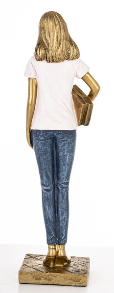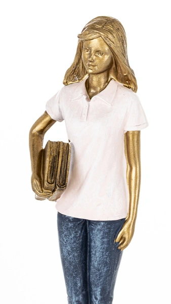 Ta delikatna, pełna wdzięku figurka nauczycielki przedstawia kobietę z dumą trzymającą w dłoniach złotą książkę – symbol wiedzy, pasji i zaangażowania. Subtelnie opracowane detale sukienki, włosów i książki tworzą spójną, estetyczną całość, która pięknie prezentuje się zarówno w klasycznych, jak i nowoczesnych aranżacjach. Matowa powierzchnia połączona z połyskiem złota sprawia, że dekoracja wygląda elegancko, a jednocześnie pozostaje przytulna i ciepła w odbiorze. To stylowa ozdoba do domu, idealna na biurko, komodę, półkę w salonie lub w domowym gabinecie, a także doskonały pomysł na prezent dla nauczycielki czy miłośniczki pięknych dodatków.