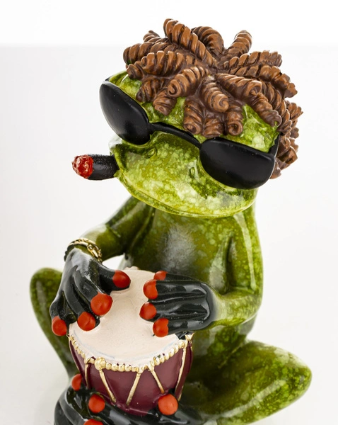 Urocza figurka żaby z bębenkiem w okularach doda wnętrzu lekkości, humoru i odrobiny artystycznego ducha, przyciągając wzrok domowników i gości.