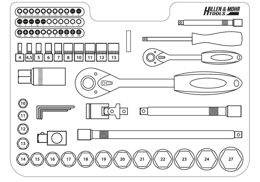 - Praktyczna walizka transportowa z wyprofilowanymi miejscami na każdy element ułatwia przechowywanie, transport i szybkie odnajdywanie potrzebnych nasadek.