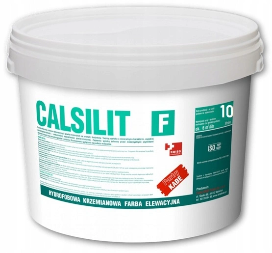 Farba silikatowa Calsilit F biała 10L Kabe to wysokiej jakości krzemianowa farba elewacyjna na bazie potasowego szkła wodnego. Przeznaczona jest do wykonywania trwałych, mineralnych powłok malarskich na zewnątrz budynków, wyłącznie na podłożach mineralnych, takich jak beton, tynki wapienne, wapienno-cementowe, cementowe oraz cienkowarstwowe tynki mineralne i silikatowe. Dzięki zastosowaniu substancji hydrofobizujących tworzy powłokę, która jednocześnie oddycha i skutecznie chroni elewację przed działaniem opadów atmosferycznych.