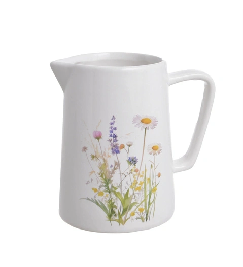 Biały dzbanek ceramiczny w polne kwiaty to subtelna ozdoba, która od razu przywodzi na myśl spokojne, letnie poranki na wsi. Jasne tło pięknie eksponuje motyw drobnych, kolorowych kwiatów, tworząc efekt lekkiej, romantycznej akwareli. To dekoracja pełna uroku, która doskonale wpisuje się w przytulne, kobiece wnętrza – od kuchni w stylu prowansalskim, po salon w klimacie boho czy klasycznej elegancji.