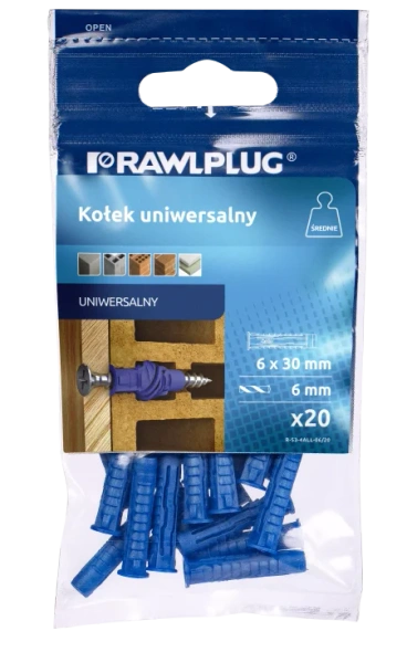Kołek uniwersalny 4ALL 6x30mm 20szt przeznaczony jest do mocowania lekkich i średnich elementów wyposażenia w różnych typach podłoży. Doskonale sprawdzi się przy montażu akcesoriów łazienkowych, półek i szafek ściennych, uchwytów, wsporników, osprzętu elektrycznego, opraw oświetleniowych czy skrzynek na listy. Dzięki uniwersalnej konstrukcji można go stosować zarówno w betonie i cegle, jak i w podłożach z pustkami oraz w płytach gipsowo-kartonowych, co czyni go praktycznym rozwiązaniem do większości prac wykończeniowych i remontowych.