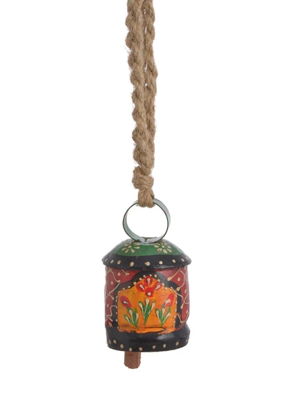 - Dzwonek metalowy zawieszka czerwono-zielona kwiaty sznur jutowy 8,5 cm