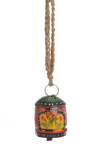 Dzwonek metalowy zawieszka czerwono-zielona kwiaty sznur jutowy 9,5 cm