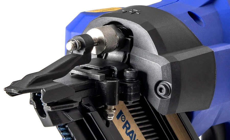 - Beznarzędziowa regulacja głębokości wbijania gwarantuje precyzyjne i estetyczne osadzenie gwoździ bez uszkadzania powierzchni materiału.