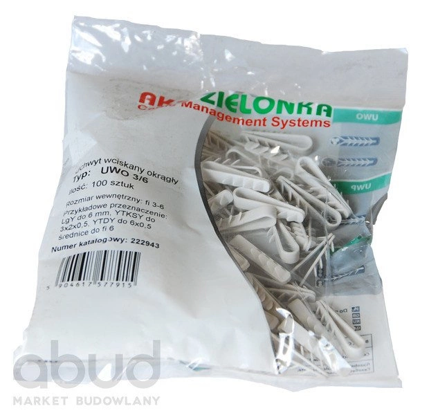 - Uchwyt wciskany okrągły UWO 3/6 100szt AKS ZIELONKA- przeznaczony do mocowania przewodów oraz elementów okrągłych o średnicy 3 mm. Umożliwiają szybki montaż poprzez wciśnięcie uchwytu wraz z elementem w wywiercony otwór.