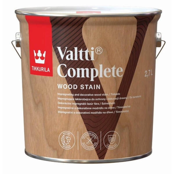 Wielkość opakowania:Matowa lekierobejca z dodatkiem wosku Tikkurila Valtti Complete (2,7L)