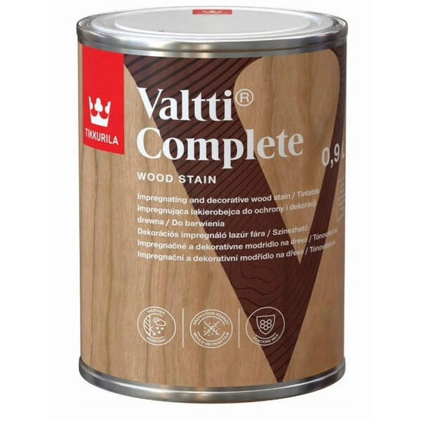 Bardzo trwała, półmatowa, impregnująco-dekorująca lakierobejca do malowania drewna na zewnątrz pomieszczeń, do barwienia. Stworzona na bazie innowacyjnej technologii Triple Resin System, opartej na unikalnym połączeniu trzech wysokiej jakości żywic o różnej funkcjonalności, gwarantujących zwiększoną odporność i zabezpieczenie pomalowanej powłoki. Dodatkowo Tikkurila Valtti Complete posiada Double Absorb UV System (podwójny system ochrony przed promieniowaniem UV).