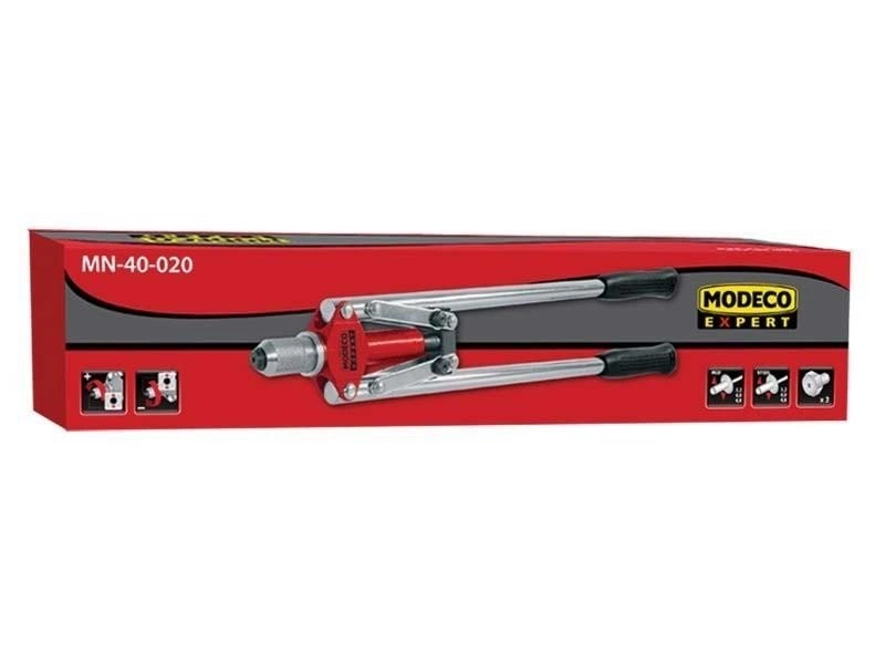 Nitownica dwuręczna 540mm MN-40-020 Modeco to niezawodne narzędzie stworzone do trwałego łączenia materiałów za pomocą nitów stalowych lub aluminiowych. Dzięki długości 540 mm oraz wygodnym, antypoślizgowym rękojeściom praca staje się komfortowa i bezpieczna, nawet przy intensywnym użytkowaniu. Rewolwerowa głowica pozwala na szybką wymianę końcówek, co umożliwia stosowanie różnych rozmiarów nitów. Solidna konstrukcja sprawia, że nitownica doskonale sprawdza się podczas prac remontowo-budowlanych, zarówno w warunkach profesjonalnych, jak i domowych.